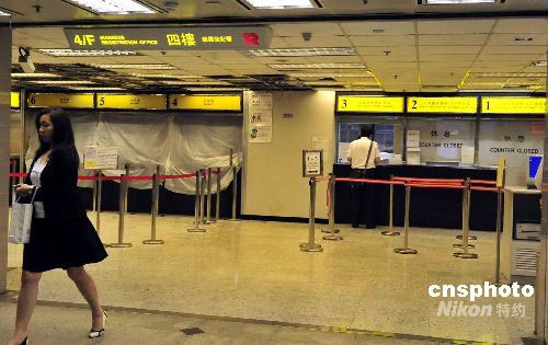 十月三日,香港税务局商业登记署恢复办公,但被纵火的五及六号柜位,仍然封闭,熏黑的假天花已被拆除。湾仔税务大楼四楼商业登记署昨天被人纵火,涉案的五十一岁男子,继续被警方拘留。中新社发 谭达明 摄