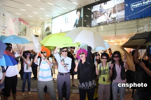 十月十日晚,香港一环保团体组织了一次五分钟的反对光污染“快闪”行动。手持五颜六色雨伞、佩戴墨镜的抗议者在皇室堡商场门前的行人路上“漫游”。中新社发 陈京松 摄