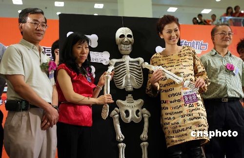 二十六日,香港骨质疏松基金会为响应“世界骨质疏松日”在将军澳东港城举办名为“全城骨健站起来嘉年华”,透过一系列活动,提升市民对骨质疏松症的认识及关注。香港骨质疏松基金会会长创会会长刘明珠医生(左二)、麦勤兴医生(左)及艺人周丽淇(右二)等主持开幕仪式。中新社发 洪少葵 摄