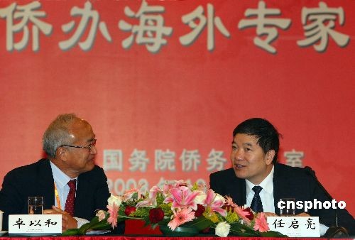 10月27日,第二届国务院侨办海外专家咨询委员会会议在北京举行。图为国务院侨务办公室副主任任启亮(右)与华裔美籍电机工程学家卓以和(左)在会上交流。中新社发 廖文静 摄