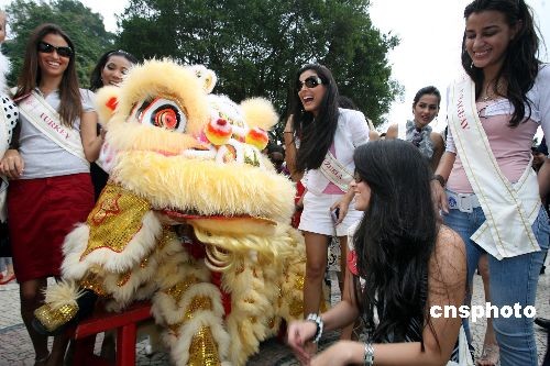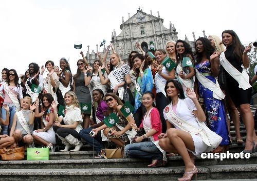 十一月一日,第四十八届国际小姐选美大赛的六十三名候选佳丽在澳门参观大三八牌坊等世遗景点,体味中华传统文化魅力。中新社发 武仲林 摄