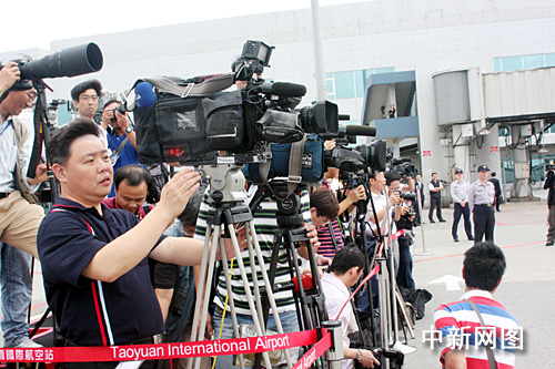 图:大批媒体在桃园机场守候陈云林包机抵台