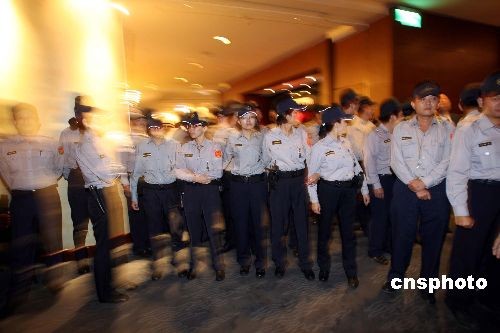 十一月五日晚,国民党主席吴伯雄在台北晶华酒店宴请海协会会长陈云林一行。警方重兵把守酒店外围,有人士冲击晚宴会场,在徒劳无功下与警方发生激烈推撞。中新社发 洪少葵 摄