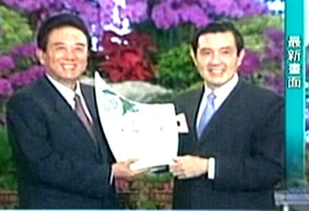 11月6日上午,马英九与海协会会长陈云林一行会面,并互赠礼物。