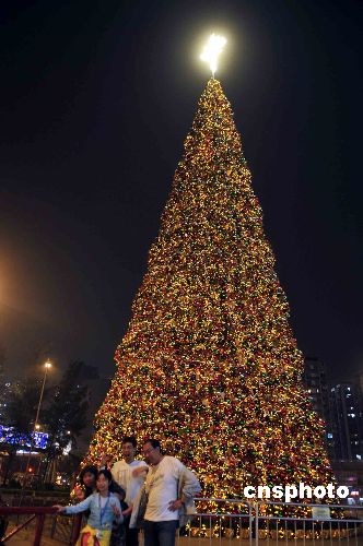 十一月下旬,香港各大商场斥巨资推广圣诞,以豪装刺激消费意欲。图为香港奥海城巨型圣诞树装饰。中新社发 谭达明 摄