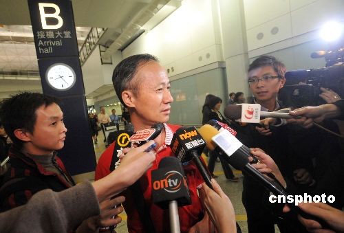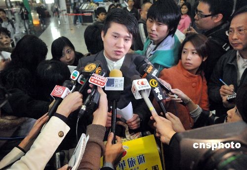 图为乘坐专机返港的乘客张先生在机场接受媒体访问。