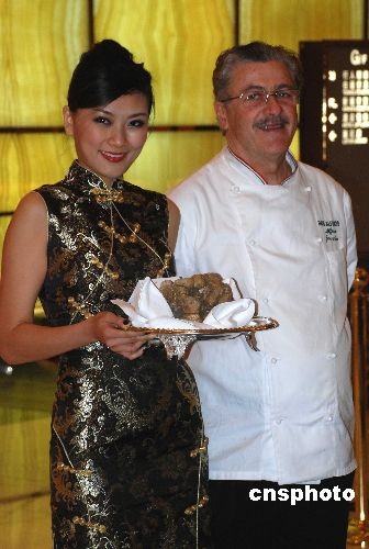 11月29日晚,在澳门、伦敦、罗马和阿布扎比卫星连线意大利白松露菌慈善拍卖会上,澳门博彩股份有限公司行政总裁何鸿燊以20万美元拍得最大的一颗白松露菌。图为礼仪小姐和厨师在澳门会场展示重1.08公斤的本年度“松露王”。中新社发 毕永光 摄