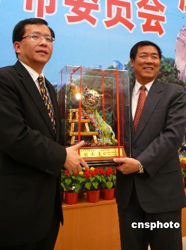 12月1日,中国国民党台中市委员会主委张逸华(左)率领参访团一行23人莅厦参访。这是国共两党展开基层党务交流以来厦门与台中市之间第3次互访。图为中共厦门市委书记何立峰(右)会见海峡彼岸贵宾之后双方互赠礼物。中新社发 杨伏山 摄