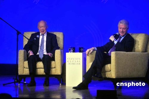 图为克林顿与新加坡资政李光耀(左)进行对话。