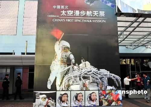 “中国首次太空漫步航天展”将于十二月六至十五日在香港科学馆举行。展览将介绍中国载人航天工程,以及今年顺利完成出舱任务的神舟七号宇宙飞船及航天员;主要展品则包括神舟七号宇宙飞船的返回舱、航天服、航天员出舱后所展示的国旗,以及近百帧珍贵的相关图片。图为巨幅宣传海报在科技馆门前展示。中新社发 谭达明 摄