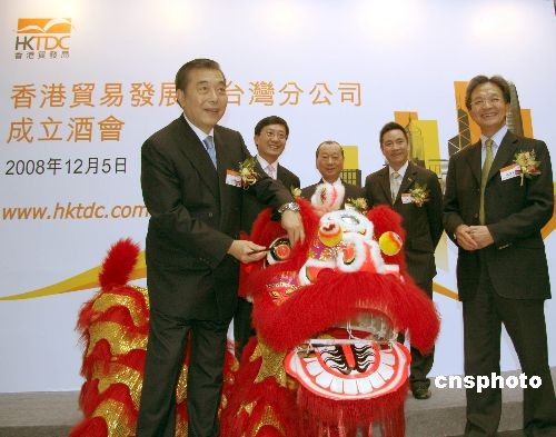 12月5日下午,香港贸易发展局台湾分公司在台北成立。香港贸发局主席苏泽光表示,在台湾的办事处的正式成立,将推动港台两地未来紧密合作、开发大陆市场。图为香港贸发局主席苏泽光(右一)与台湾“外贸协会”董事长王志刚(左一)为醒狮点睛。中新社发 刘舒凌 摄