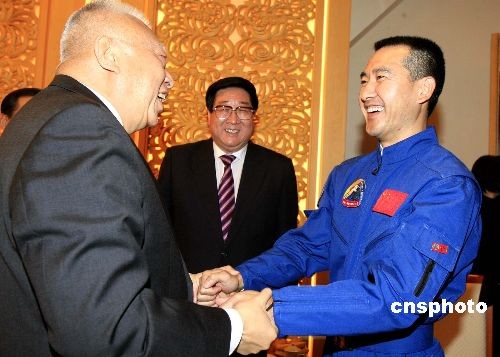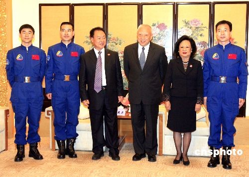 十二月六日,全国政协副主席董建华在中央人民政府驻香港联络办公室会见“神舟七号”载人航天飞行代表团一行,并与代表团团长及三名航天员合影留念。中新社发 张勤 摄