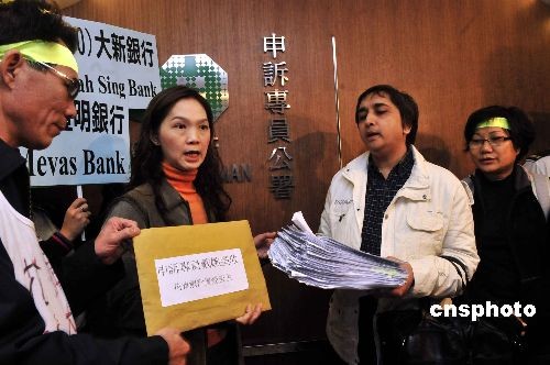 十二月十二日,香港数百名购买了雷曼相关产品的市民发起游行。图为苦主代表向申诉专员公署投诉金融管理局监管不力。中新社发 谭达明 摄
