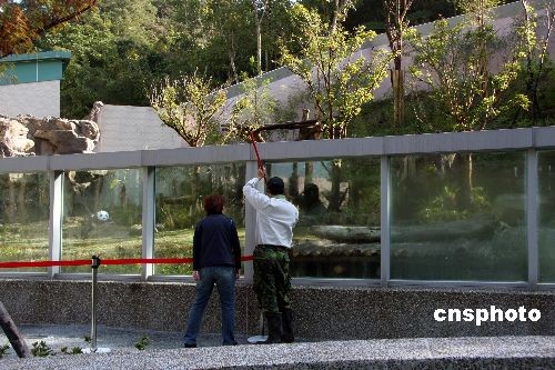 12月18日上午,台北市动物园进行“游客参观大猫熊动线测试”演练,检验动物园方面目前所规划的馆内教育展示解说、游客流量、流速及动线顺畅度。图为工人在为“团团”、“圆圆”新家做护墙保洁。中新社发 刘舒凌 摄