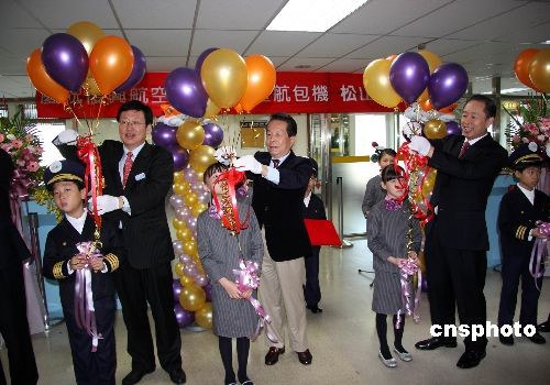12月21日上午,大连市副市长戴玉林(左一)、台湾复兴航空公司总经理田地(左二)在台北松山机场出席台北-大连首航庆祝仪式。中新社发 陈立宇 摄