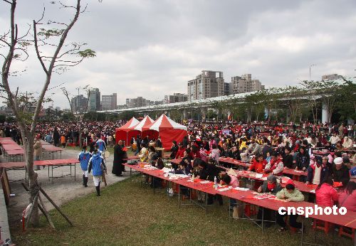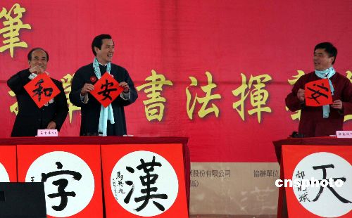 台北市政府主办的第五届“汉字文化节”于二〇〇九年的第一天在台北中央艺文公园举行,吸引了一万二千多民众共挥毫迎新年。图为台湾地区领导人马英九,台湾立法机构负责人王金平和台北市长郝龙斌等各界人士共同挥毫为新年祈福。中新社发 路梅 摄