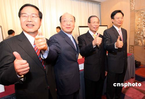 一月七日,台湾台中市长胡志强(左二)、台中县长黄仲生(右二)、彰化县长卓柏源(右)、南投县长李朝卿在香港举行记者会,向港澳媒体行销台湾人文景观和旅游资源。中新社发 洪少葵 摄