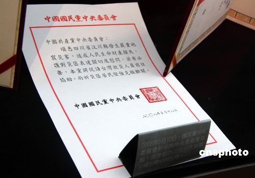 正在台北中国国民党中央党部党史展览厅举办的“跨越三世纪——中国国民党的变与不变”展览,展出许多珍贵史料。图为2008年5月12日,中国国民党中央委员会就汶川大地震向中国共产党中央委员会发出的电函。中新社发 陈立宇 摄