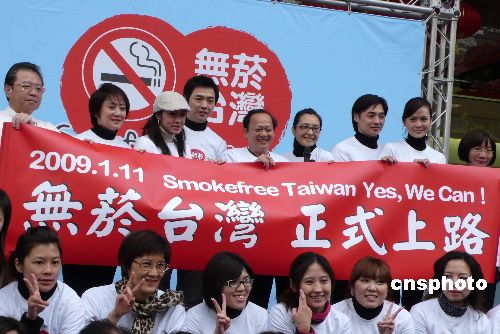 台湾新“烟害防制法”十一日起正式实施,三人以上室内职场及公共空间禁烟,至少影响五十万个场所,烟品促销广告也大幅限缩,违者加重罚则。“卫生署”署长叶金川(右四)十日在街头宣导台湾烟害防制新法,呼吁大家共创无烟台湾。中新社发 路梅 摄