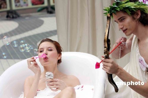 二月五日,为迎接情人节,香港一家商场在铜锣湾闹市街头上演美人出浴,推介情人节沐浴套装,化身“爱神”丘比特的模特也来凑热闹,一起预祝情人节甜甜蜜蜜沐浴爱河。中新社发 洪少葵 摄