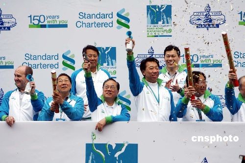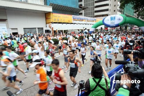 二月八日清晨,香港一年一度的马拉松赛在尖沙咀弥敦道举行,特区行政长官曾荫权及众多嘉宾主持全程马拉松赛起步仪式。本屆马拉松赛三项赛事共吸引中外选手五万五千人参加,打破历届纪录。中新社发 洪少葵 摄