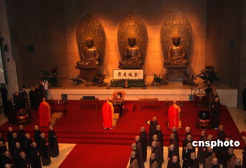 2月15日,台湾法鼓山创办人圣严法师追思法会暨植存在法鼓山举行。图为圣严法师生前挚友今能、宽裕及广慈三位主法长老在世界佛教教育园区大殿唱诵心经,送圣严法师最后一程。中新社发 陈立宇 摄