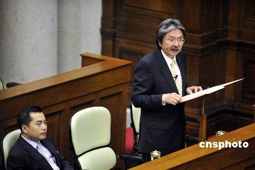 二月二十五日,香港特区财政司司长曾俊华在立法会大楼会议厅向立法会提交二零零九至二零一零年度财政预算案。中新社发 谭达明 摄