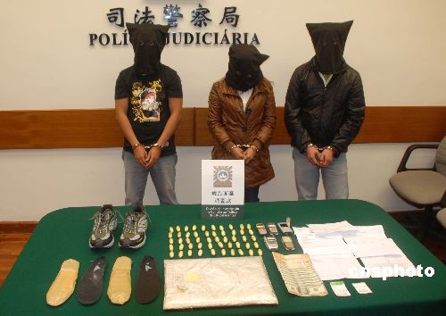 澳门警方三月八日、九日连破三起跨国贩毒案,在澳门国际机场抓获三名菲律宾籍毒贩,他们分别通过体内藏毒及行李、鞋子夹带等方式带入的海洛因二千九百克。中新社发 毕永光 摄