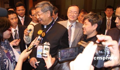 原全国人大常委会副委员长许嘉璐3月21日下午抵达台北,出席“第三届海峡两岸客家高峰论坛”。许嘉璐此次访问台湾是以叶圣陶研究会名誉会长的身份。图为许嘉璐在论坛上受到大批记者和客家乡亲包围。中新社发 耿军 摄