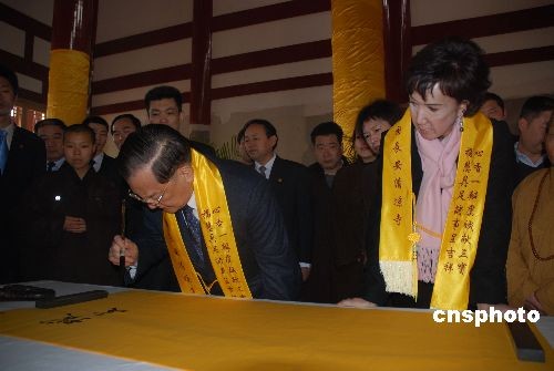 4月3日,中国国民党荣誉主席连战西安祭拜祖母,执笔写下“璞真纳清凉,福地有圣泽”的题词赠予清凉寺,并向寺院捐赠1万元人民币善款。图为连战题词的场景。 中新社发 冽玮 摄