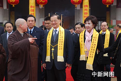 祭拜后连战一行走进清凉寺,在新落成的大雄宝殿内,清凉寺主持传恒法师表示再次见到连战感到很亲切,连战不远千里到大陆祭祖,体现了中华民族的孝道和美德。作者:冽玮