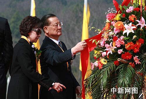 中国国民党荣誉主席连战向黄帝敬献花篮,并向黄帝像鞠躬行礼。图为连战夫妇走向典礼台敬献花篮。中新社记者 冽玮 摄