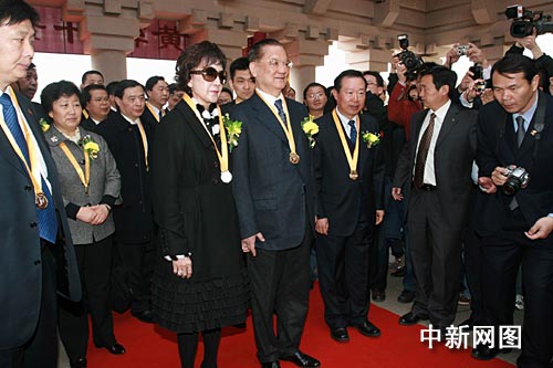 今日上午九时五十分,公祭黄帝典礼正式开始,全体肃立,击鼓鸣钟。在古乐声中,中国国民党荣誉主席连战向黄帝敬献花篮。图为连战夫妇向黄帝像鞠躬行礼。中新社记者 冽玮 摄