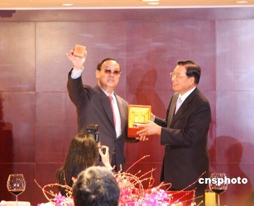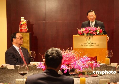 大陆海协会副会长安民四月六日率“海协会经贸交流考察团”一行十四人抵达台湾,开始为期七天的访问。台湾海基会董事长江丙坤在香格里拉台北远东国际大饭店宴请安民一行。 中新社发 耿军 摄
