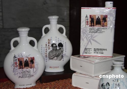 4月13日是蒋经国先生百年诞辰,台湾烟酒公司配合推出3款蒋经国百年诞辰纪念酒。图为其中一款仿古的白磁提耳瓶,在台湾陶瓷重镇莺歌订作陶瓷瓶身,装入台湾原窖高梁酒,一面印有1986年马英九担任翻译时,和经国先生的合照。酒瓶的另一面印有蒋经国先生抱着小女孩的合照,表现蒋经国先生的亲民形象。中新社发 耿军 摄