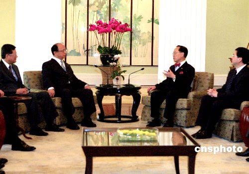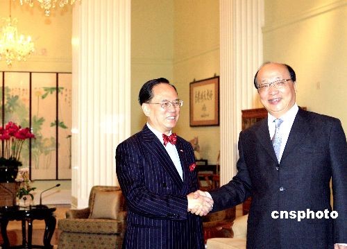 四月十五日,香港特区行政长官曾荫权在香港礼宾府与台中市长胡志强率领的访港代表团会面。中新社发 张勤 摄