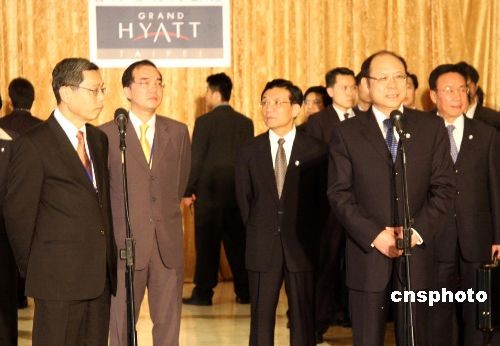 大陆海协会协商代表团一行四月十七日下午抵达台北。图为代表团入住君悦大饭店时,台湾海基会副董事长高孔廉(左一)在大堂迎候。海协会常务副会长郑立中(右二)、副会长李炳才(右三)、李亚飞(右一)与等候的媒体记者见面,郑立中发表简短谈话。中新社发 耿军 摄