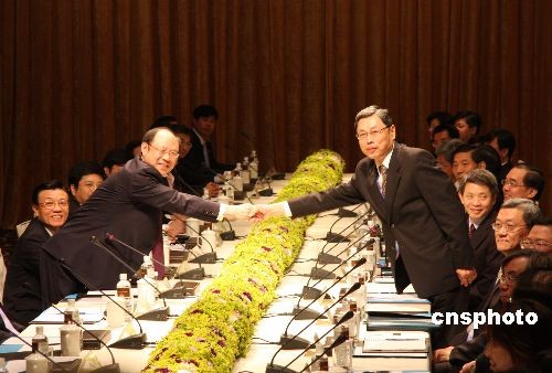 四月十八日,海协会与海基会在台北君悦饭店三楼就两会领导人第三次会谈的相关事宜进行预备性磋商。图为会谈开始时海协会副会长郑立中(左)与海基会副董事长高孔廉握手。中新社发 耿军 摄