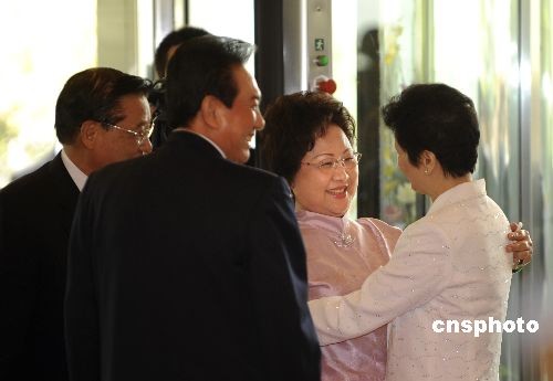 4月25日,陈云林携夫人赖晓华在南京紫金山庄迎接江丙坤同夫人陈美惠一行。海协会和海基会第三次会谈26日将在南京紫金山庄举行。中新社发 廖攀 摄