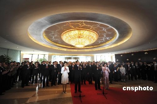 4月25日,陈云林携夫人在南京紫金山庄迎接江丙坤一行。海协会和海基会第三次会谈26日将在南京紫金山庄举行。中新社发 廖攀 摄