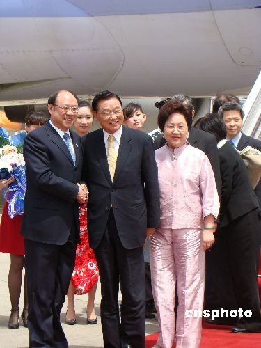 4月25日上午10点50分许,台湾海峡交流基金会董事长江丙坤率海基会代表团抵达南京禄口机场。海协会副会长郑立中、江苏省台办主任陈尧等在机场迎接。中新社发 丁梅 摄
