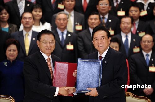 4月26日下午,陈云林和江丙坤交换协议文本。当日,海协会和海基会在南京紫金山庄签署《海峡两岸空运补充协议》、《海峡两岸金融合作协议》、《海峡两岸共同打击犯罪及司法互助协议》三项协议。中新社发 廖攀 摄