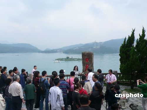 五月一日,大陆游客排队在台湾日月潭参观留念。中新社发 邓敏 摄