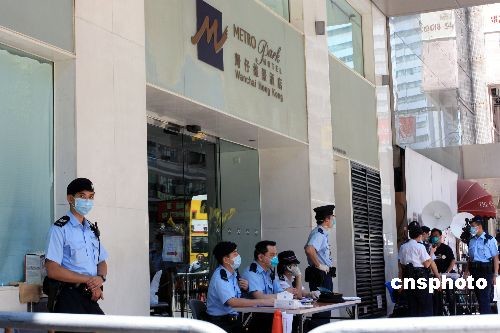 五月二日,香港首宗甲型H1N1流感个案患者曾入住的香港湾仔维景酒店,大批戴着口罩的警员在酒店四周戒备,酒店员工和住客需逗留在酒店内或被送往用作隔离中心的度假村,直至“隔离令”撤销为止。中新社发 陈伊敏 摄