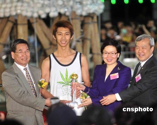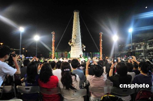 五月三日零时,香港长洲太平清醮抢包山决赛举行,十男二女选手奋勇争先,数十秒内已爬上包山顶,抢摘最高分的平安包。中新社发 谭达明 摄