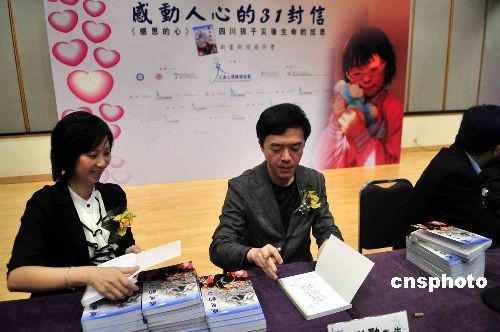五月八日,台湾资深音乐人陈乐融,为新书《感恩的心-四川孩子灾后生命的反思》举行签名会。新书作品分别来自四川地震重灾区,收集超过千多篇文章,最后经评委会挑选得奖入围共三十一篇。中新社发 谭达明 摄