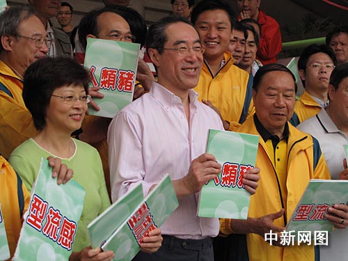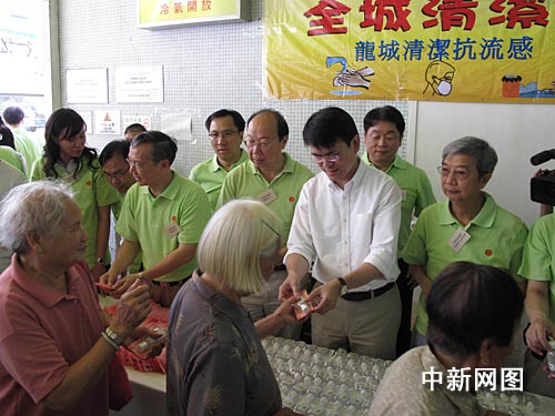 香港五月十日在全城十八个区同步展开“全城清洁日”行动,倡导民众一齐参与环境清洁,防范甲型H1N1流感(港称“人类猪型流感”)疫症。特区政府政务司司长唐英年与民政事务总署署长陈甘美华等来到深水埗区的保安道街市,参与深水埗区的“全城清洁日”活动。