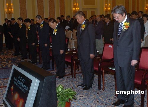 “推进粤港澳更紧密合作大型研讨会”五月十二日在澳门举行。开幕前,澳门特区行政长官何厚铧、中央驻澳联络办主任白志健、外交部驻澳特派员公署特派员卢树民、香港特区政府财政司司长曾俊华等与会的两岸四地人士为汶川地震遇难者默哀一分钟。中新社发 毕永光 摄