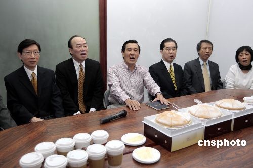 3月30日,台湾地区领导人选举当选人马英九(左二)在国民党中央党部大楼接见女师附小小学同学,在会见室里一起唱起校歌并切蛋糕表示庆祝。中新社发 杜洋 摄
