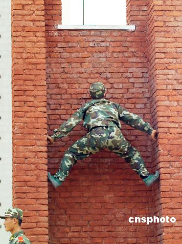 2006年8月17日,武警湖北总队某部官兵冒着高温酷暑进行演练。中新社发 宋建春 摄